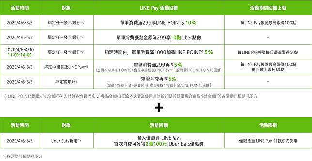 活動內容:已註冊LINE Pay的用戶於 Uber Eats手機應用程式消費結帳時,透過LINE Pay使用已綁定的任一發卡銀行信用卡/簽帳金融卡付款,享以下優惠: