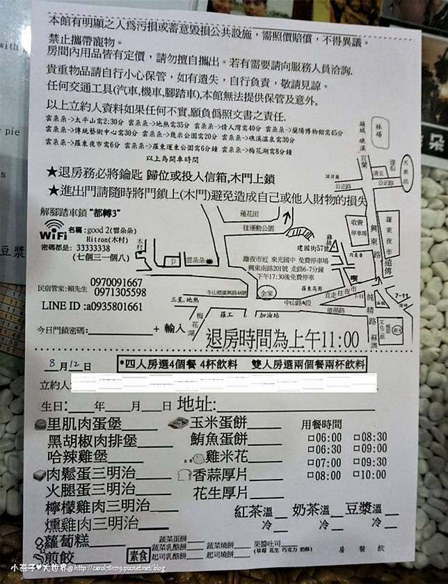 入住注意事項,還有網路密碼、腳踏車租借、簡單的交通時間,隔天的早餐自己選~