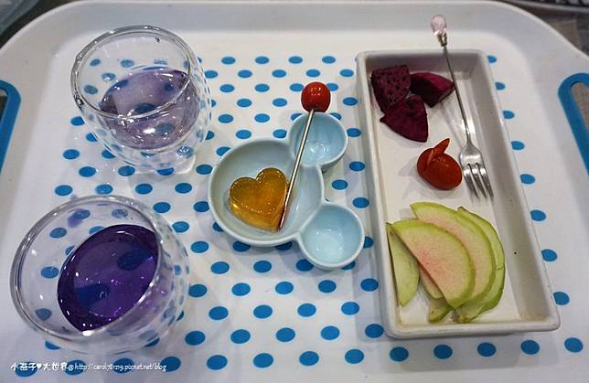 看看那愛心茶凍好看又好吃! 自己切的水果,還有老闆泡的蝶豆花汽水,邊吃邊聽老闆跟我們介紹民宿還有附近跟宜蘭其他地方的景點介紹