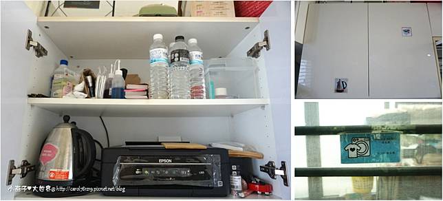櫃子外貼著照片,貼什麼裡面就有什麼~紗窗後面的小陽台有洗衣機跟烘衣機可以使用,如果是環島、國外旅客這都非常方便啊!