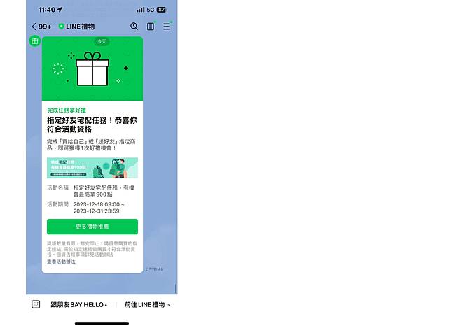 1. 符合本活動資格者將於2023年12月18日(一)起收到「LINE禮物」官方帳號發送之「指定好友宅配任務」活動通知。