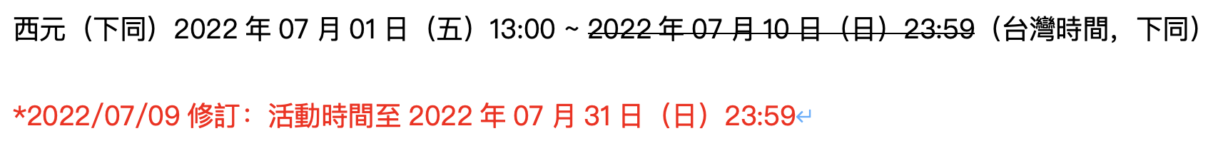 西元(下同)2022年07月05日(二)~ 2022年08月15日(日)(台灣時間,下同)
