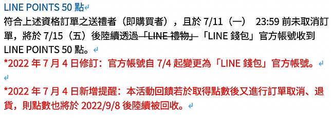 符合上述資格訂單之購買者,將於訂單成立24小時後陸續透過「LINE錢包」官方帳號收到LINE POINTS 35點。