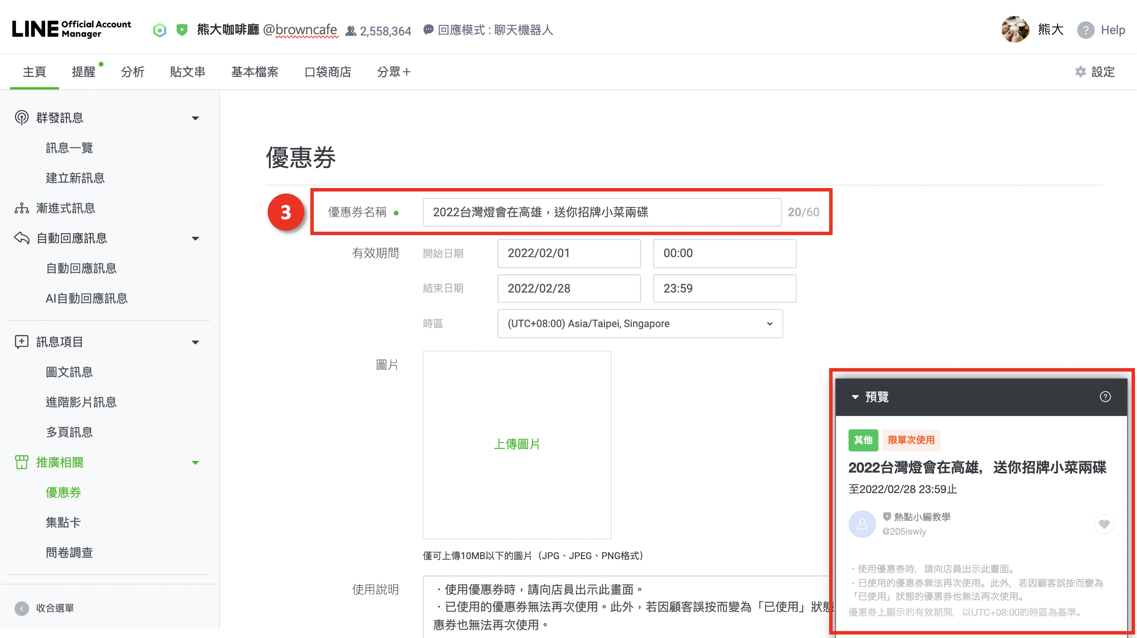 ▶ 超心動🤩 跟著步驟走🚶5分鐘輕鬆搞定官方帳號優惠券設定