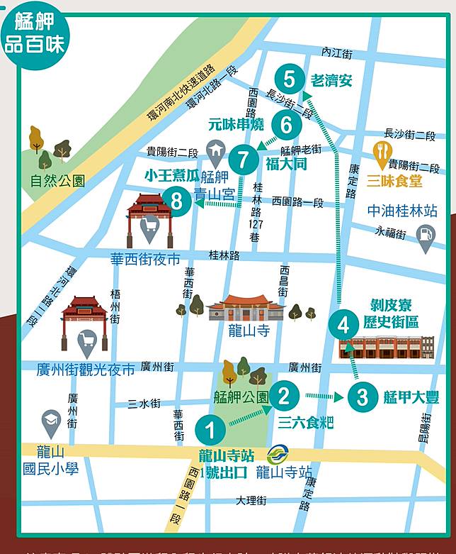 遊程路線:三六食粑 (看地圖)糕粿祭祀文化體驗-->艋甲大豐(看地圖)好丸DIY體驗-->剝皮寮歷史街區走訪-->老濟安 (看地圖)青草茶體驗-->元味串燒(看地圖) 美食體驗-->福大同 (看地圖) 品茶體驗-->小王煮瓜(看地圖)必比登滷肉飯套餐美食體驗