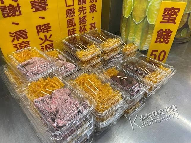 蜜餞、楊桃干、楊桃片就陳列在攤位前。