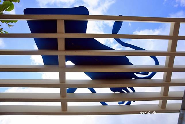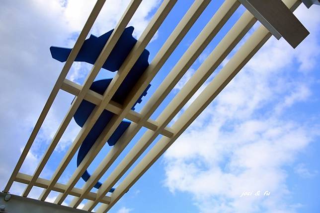 抬頭看,鏤空的木架上有海馬、烏賊、海豚、海草等悠遊藍天下,對映著海洋,覺得挺有創意