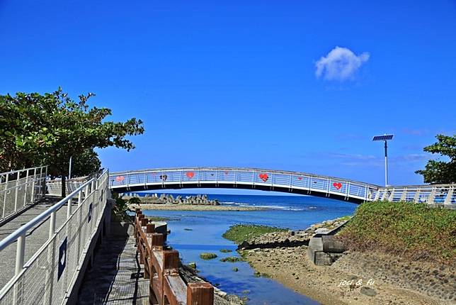 沿著步道走在大葉欖仁樹下就到后灣橋(看地圖),連結後灣溪兩岸,已改為白橋紅愛心,與景觀台、涼亭、海波浪矮牆有一系列地中海風的fu
