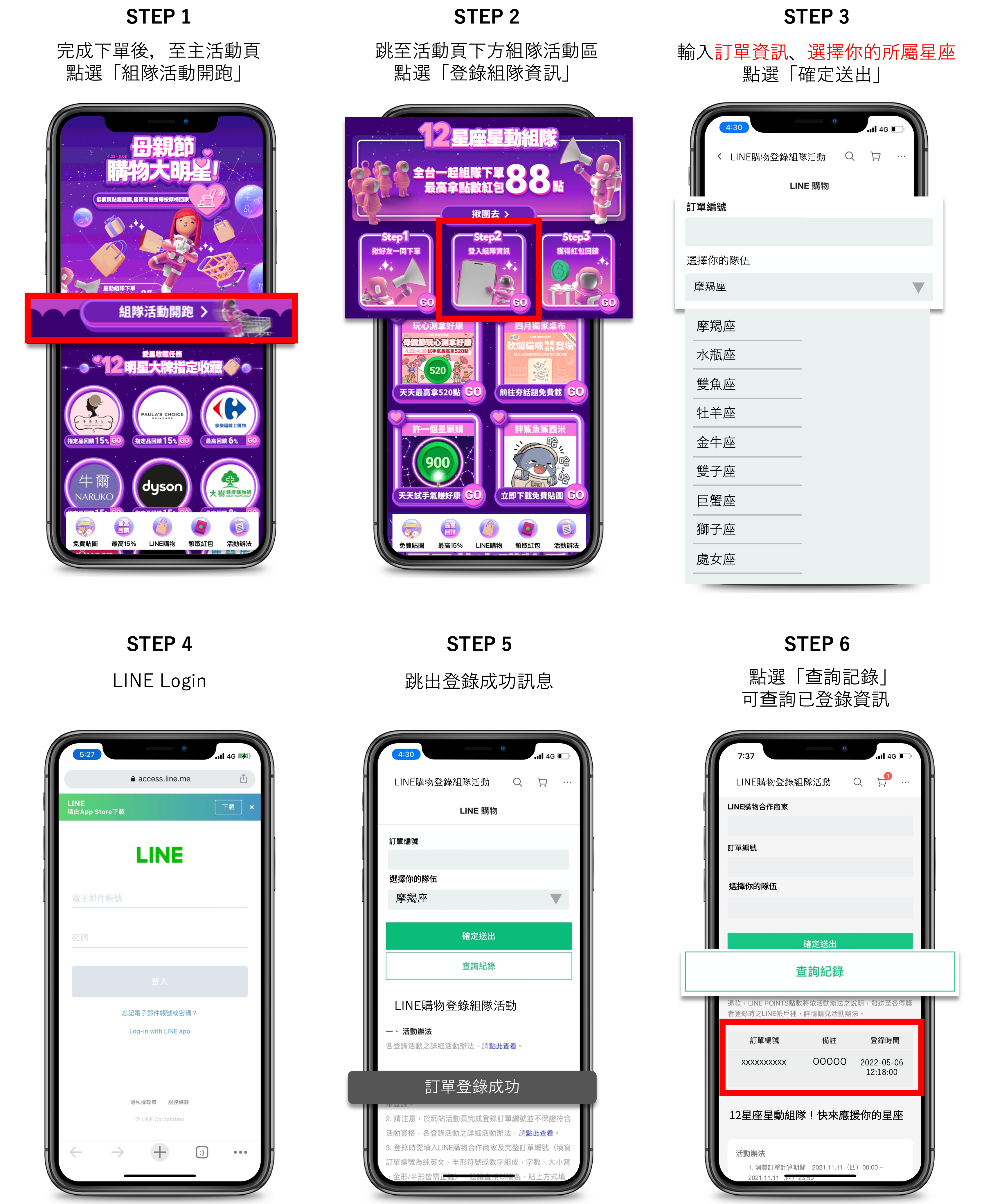 於2022/05/06 00:00-2022/05/08 23:59 指定期間透過LINE購物消費,且於2022/05/16 00:00前至訂單登錄頁完成「訂單登錄」及「選擇你的星座隊伍」。統計登錄筆數最多的隊伍,即可獲得「LINE POINTS點數紅包88點」;其他登錄隊伍,人人有機會獲得「LINE POINTS點數紅包38點」。