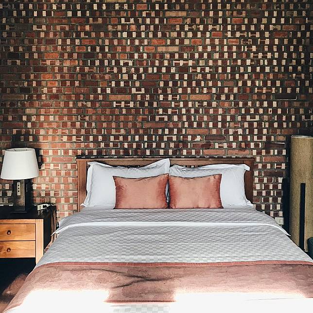 使用大量木條拼湊、有著整面的紅磚牆、部份裸露的水泥與深色系床組,讓人深深著迷於這樣硬派卻又舒適的空間設計,心生嚮往。