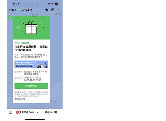 1. 符合本活動資格者將於2023年12月04日(一)起收到「LINE禮物」官方帳號發送之「指定好友專屬任務」活動通知。