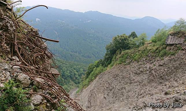 第1明隧道中段在88風災時嚴重崩塌,裸露的鋼筋顯示著天災摧毀的可怕力量…小心而迅速地通過,以避免岩石掉落…