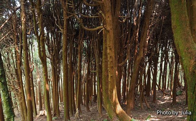 ↓ 繼續前行來到8.2K處,左手邊的杉木群生長茂密,彼此樹枝交錯遮蔽了大部分光線,宛如一片黑森林~