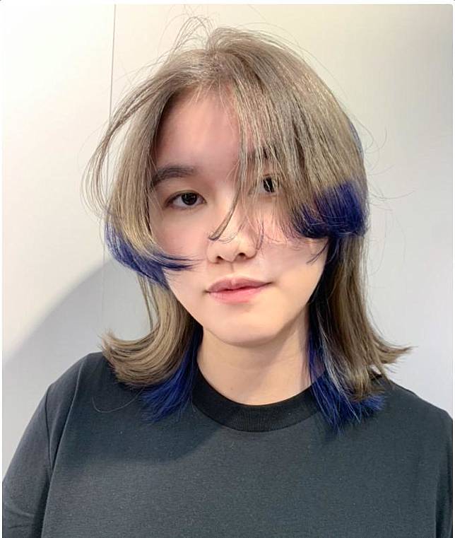 整個髮型都是以藍色為主,但只有髮尾有先做漂髮的處理。這樣視覺上就是利用裙襬染的效果做出層次感!