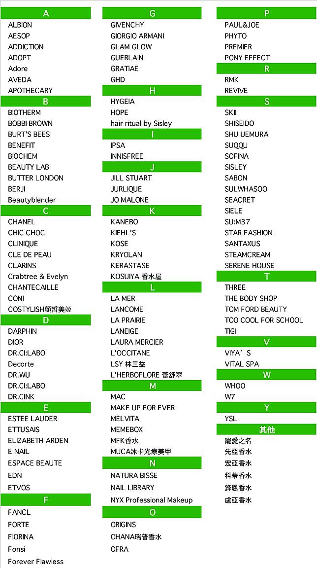 3. 各分館化妝品指定櫃位,請見下方列表。