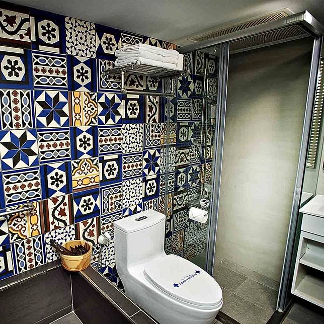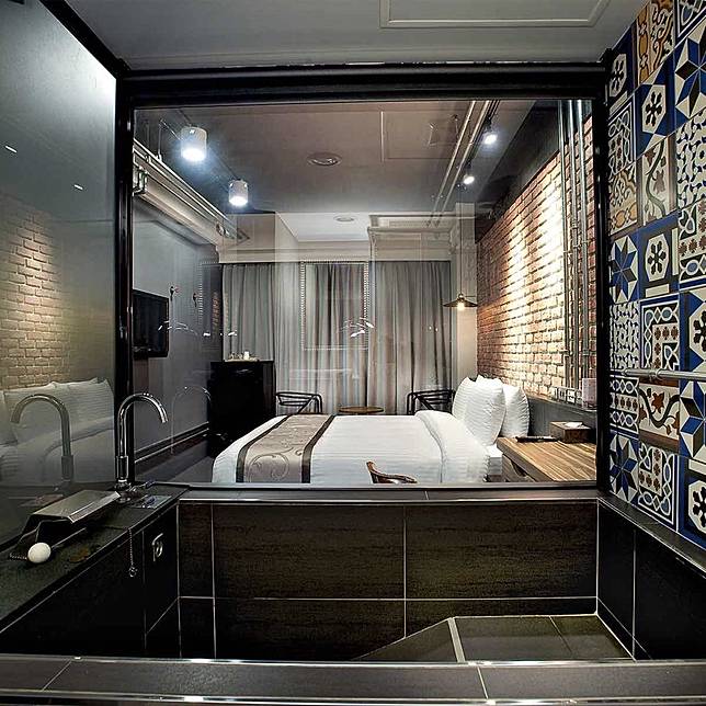 紅磚牆風格的臥室、可以滾個兩圈的大床,加上貼上藍色雕花磁磚的浴室,是不是讓人大吃一驚!