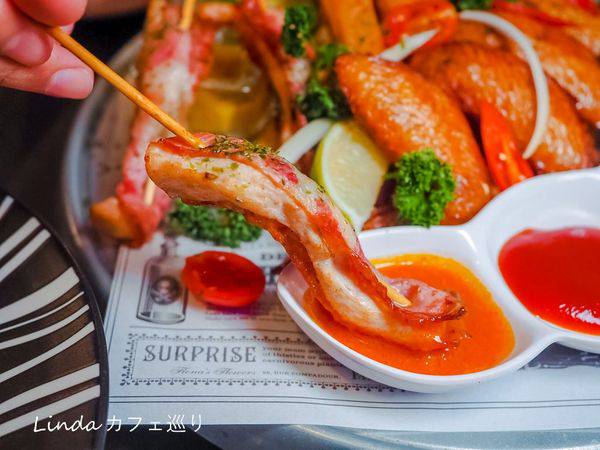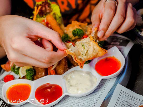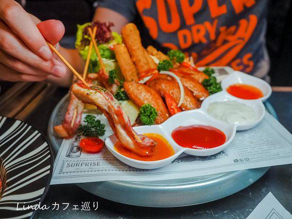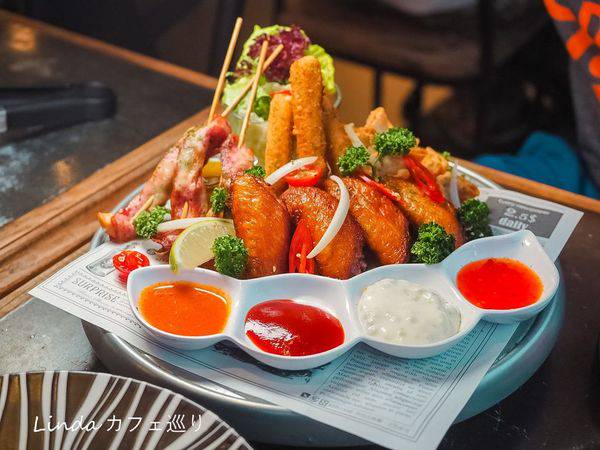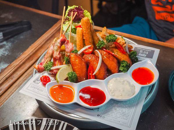 直接擁有五種超過癮的炸物組合,包含培根雞肉串+ 海鮮百寶袋+ 辣味雞翅+ 起司條+ 薯條,其中搭配四種醬料都是店家自製。