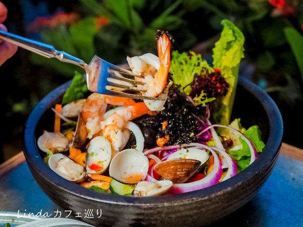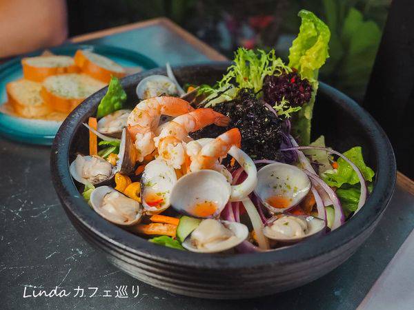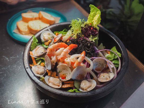 「ChuJu 雛菊餐桌」用義式料理的方式,將海鮮入沙拉豪邁的使用了新鮮蛤蠣、鮮蝦、花枝等食材