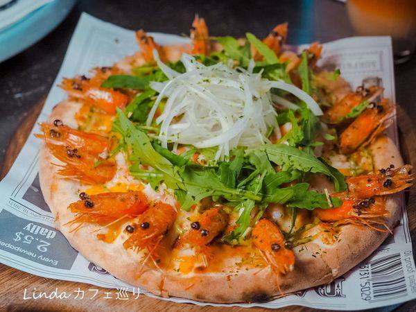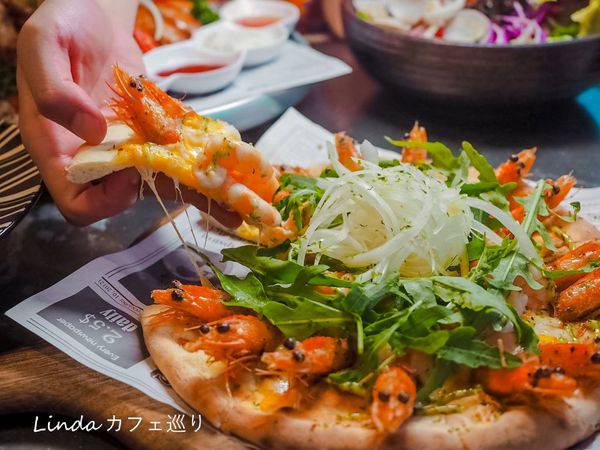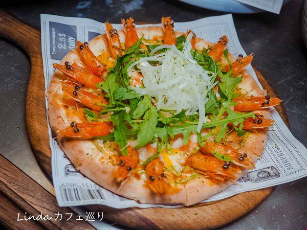 一份只要$399的青醬鮮蝦披薩,餅皮舖上大量的雙色起司,升級成豪華版上面還有16隻白蝦