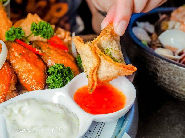 海鮮百寶袋第一次吃到,外層是像炸餛飩的造型,裡面咬下去吃多汁的肉餡,吃的到旗魚肉、蝦子等鮮味食材