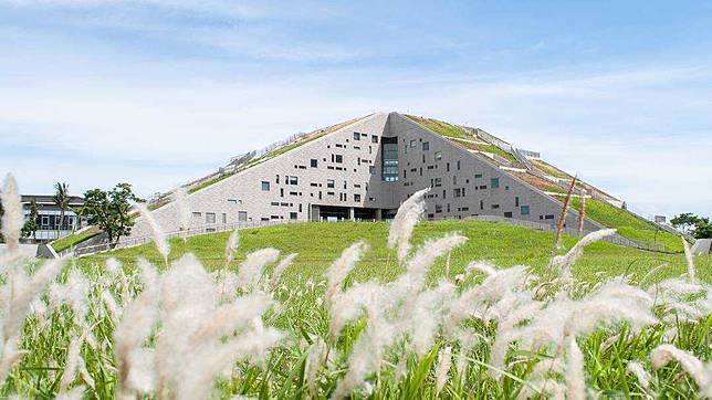 採用清水模的設計,展現質樸自然的日式禪風質感,斜面的屋頂種植大面積的草皮,遠遠看就像一座小山丘,近看像綠色金字塔建築,周邊有都蘭山、鯉魚山環繞,前方有個人造鏡心湖,屋頂還有個階梯可讓人休閒散步,這依山傍水的環境,讓人羨慕這邊的學生超幸福,除讀書外還有這世界級美景相伴。
