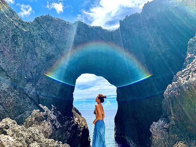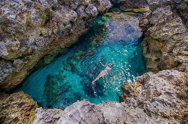 這是一座接連大海的珊瑚礁岩形成的天然游泳池,海水清澈到如綠寶石的翠綠色,會隨著潮汐漲退潮還深度不一,下水前記得評估天氣及水深狀況,並注意自身安全。天氣狀況好時,可以在這天然泳池裡自由自在游泳,一次享盡藍天白雲大海環繞得感覺,如同掉入畫作之中,浪漫到好不寫實!