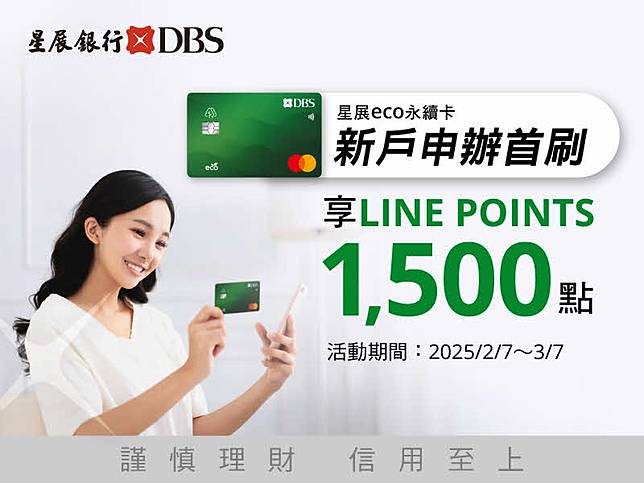 凡於申辦期間前透過LINE POINTS任務牆進入指定活動頁面新申辦星展eco永續卡正卡,並成功於指定之核卡日期前核卡成功,且於核卡日後30天內累積刷卡一般消費達NT$3,000(含)以上,並完成註冊登入【星展Card+信用卡數位服務】及成功申請信用卡電子帳單,始符合新戶首刷禮LINE POINTS 1,500 點回饋資格,正附卡消費金額合併計算,符合首刷禮累積之消費金額須廠商於核卡日後45天內請款者方列入計算。(申辦期間及指定核卡日期請詳下點)