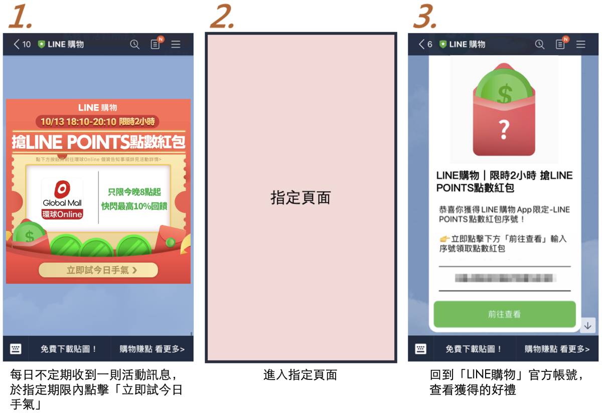 通知獲得好禮後,「LINE購物」官方帳號將發送一組序號給您,請點擊訊息下方的「前往查看」即可至我的點數紅包頁,領取點數紅包。