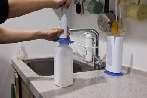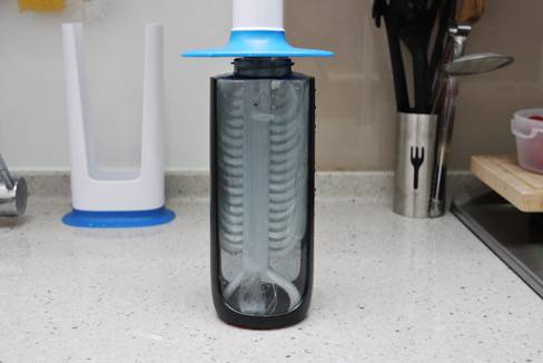 接下來就照著影片的手勢,一手固定住瓶口、一手抓住拉桿,像汲水一樣使力,一開始可能會有點卡卡,但是在水和清潔劑的助力之下,很快就發揮它的作用。