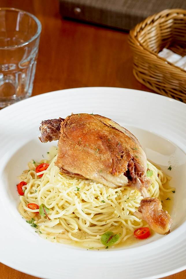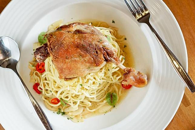 另一盤超大隻的煎鴨腿義大利麵,一端上桌有些些讓人震住了一下,因為這鴨腿真的挺大的,所幸腿肉處理的很好,所以吃起來不費力,叉子輕輕撥開,皮脆肉嫩。只是底層清炒義大利麵真的很「清炒」啊!就是橄欖油清炒的簡單滋味,走養生路線,但對於重口味的小高而言,就略顯清淡。所以喜歡鴨腿的人,可以換成燉飯,應該也很搭!
