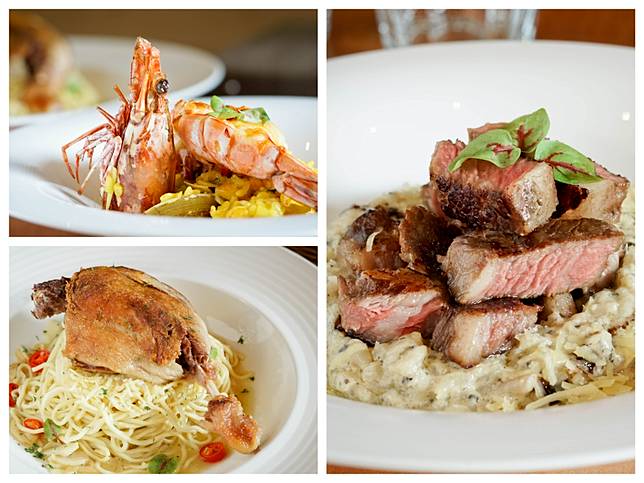 再來的「虎蝦蕃紅花燉飯」及「煎鴨腿義大利麵」就是看人吃囉!喜歡海鮮的可以選擇這一季的新品虎蝦蕃紅花燉飯,用蝦仁及蛤蠣的鮮味與番紅花去提出燉飯的香氣,本身口感沒有松露野菇燉飯來的濃郁,米粒滋味偏清香再帶點鮮味。而虎蝦肉彈性有嚼勁,新鮮程度控制得不錯。