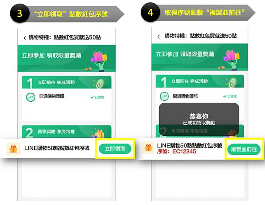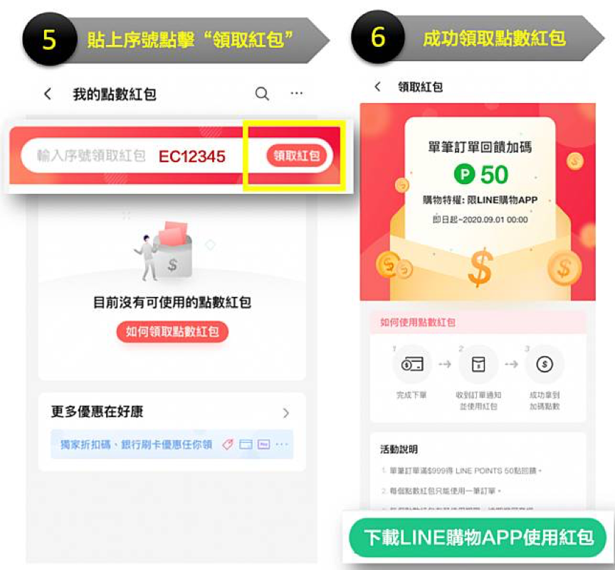 點擊「立即領取」後,即可獲得點數紅包序號,請點擊「複製並前往」可至「我的點數紅包」頁面輸入序號領取紅包,領取紅包後,用戶須下載LINE購物App,並透過LINE購物App前往夥伴頁面完成結帳且未退貨或退款,方可獲得點數回饋,請參考點數紅包使用說明。