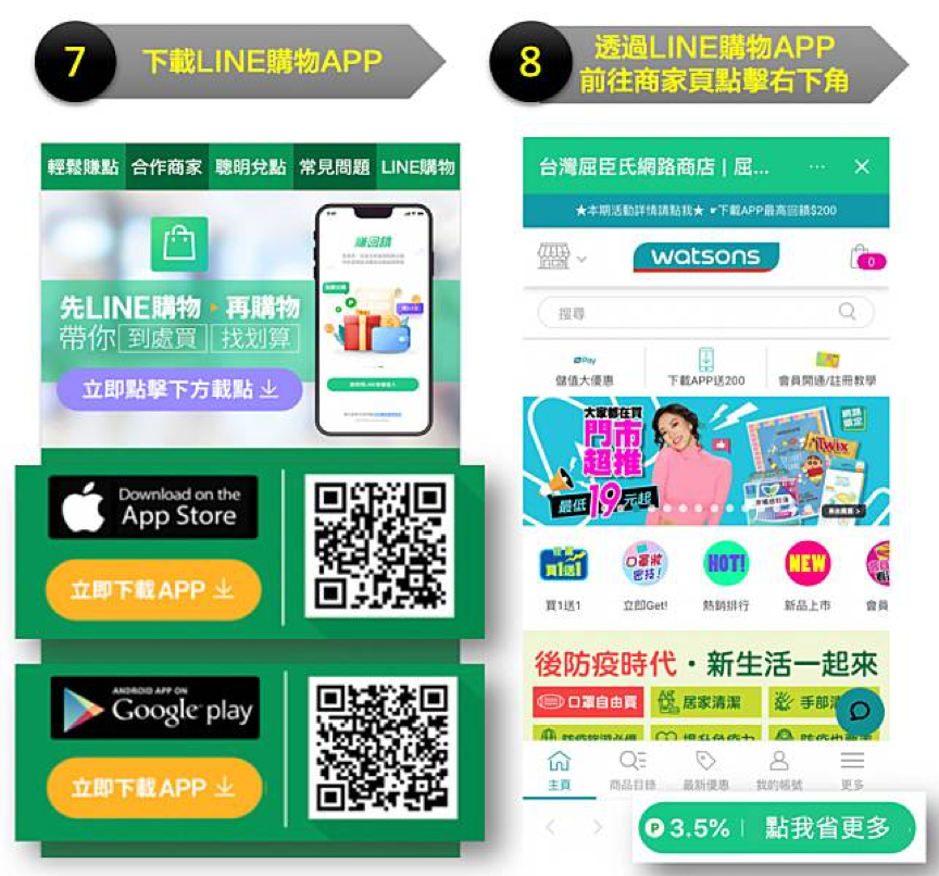 ※提醒您,LINE應用程式內之LINE購物非為「LINE購物App」! 請先至Play商店或App Store下載「LINE購物App」,透過「LINE購物App」前往合作商家成立訂單並完成結帳,該筆訂單才可使用本活動贈送的點數紅包。