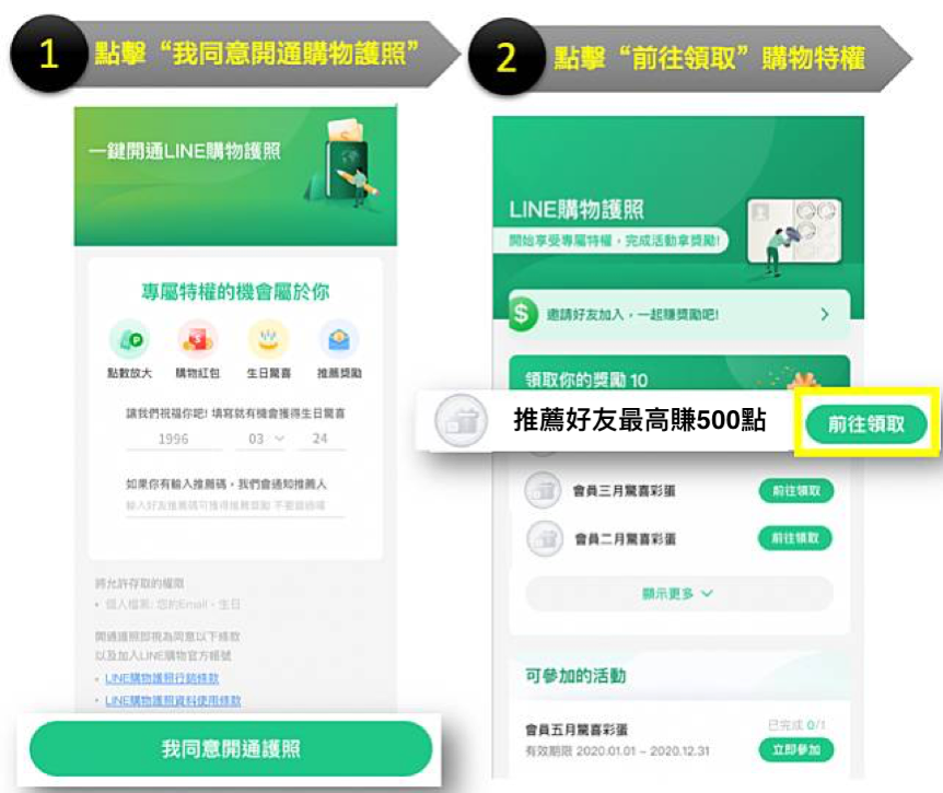 3. 獎勵全數領取完畢後,本活動即會提前結束,無法再領取獎勵,「LINE購物護照」推薦好友最高賺500點活動頁將顯示已額滿。