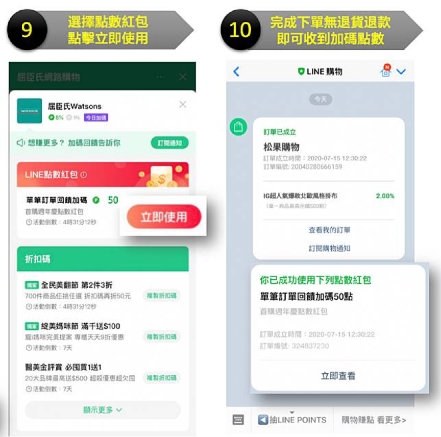 成功領取紅包後,您需透過LINE購物App前往合作商家下單,方可符合點數紅包使用條件及獲得點數回饋資格,請參閱點數紅包使用說明。
