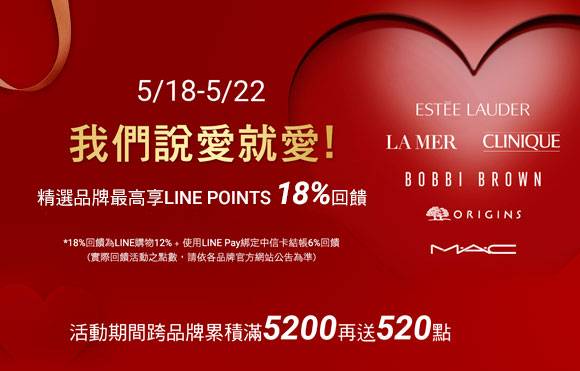 活動期間內,透過「LINE購物」 前往指定品牌官網(雅詩蘭黛 Estée Lauder、倩碧 Clinique、品木宣言、 Bobbi Brown、LA MER、M.A.C)完成消費,累計消費滿新台幣(下同)5,200元,即可參加「520我們說愛就愛-指定店家消費滿5,200元送520點」(下稱「本活動」)符合活動條件者,額外贈送520點LINE POINTS,每一用戶於活動期間最高可獲得一次520點LINE POINTS。