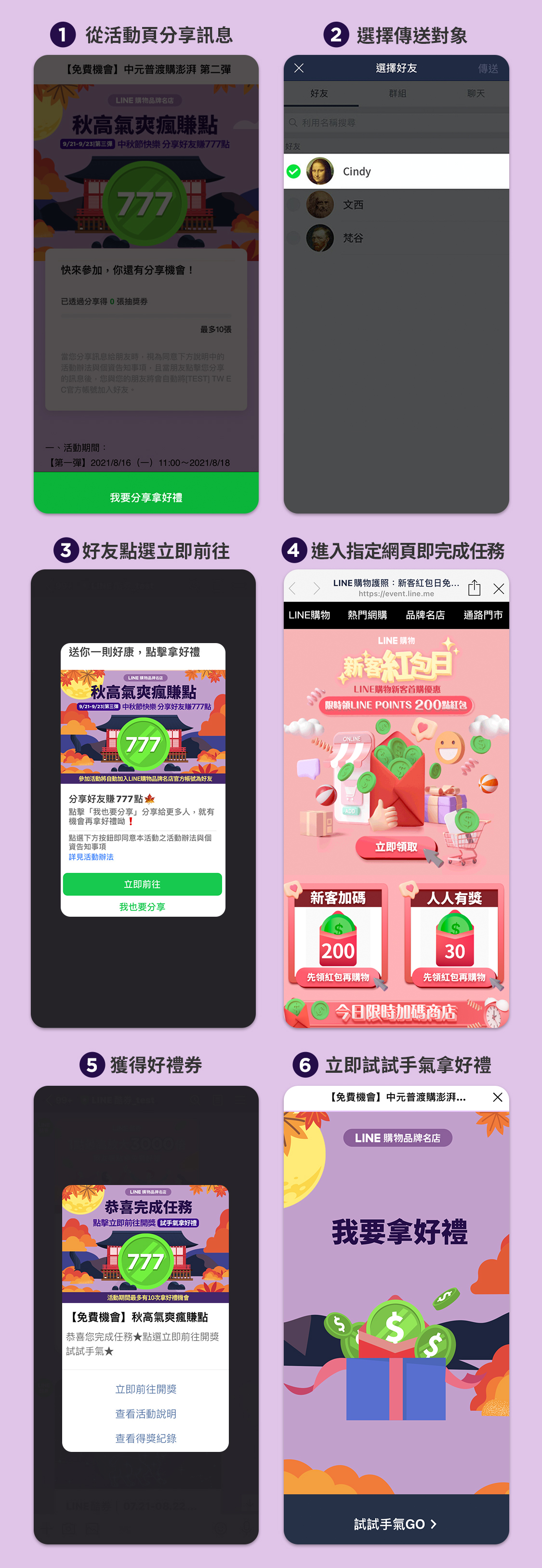 1. 分享者需透過活動頁分享網址,推薦並邀請其他LINE用戶點入指定活動頁並完成登入,分享者與被分享者即可獲得好禮。