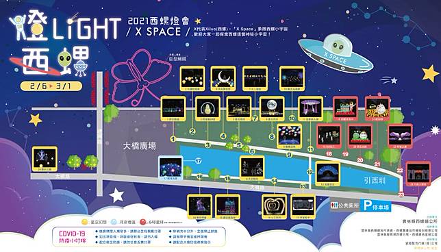 今年春節因為疫情影響,許多有年味的活動都相繼取消,但幸好雲林西螺的燈會還是照常舉辦,每年西螺大橋旁都會舉辦燈會慶祝元宵節的到來,今年燈會走科幻風規畫3大燈區分別為外星人、飛碟與時空隧道,另外還有七崁武術等23組花燈,帶領民眾走入科幻世界。