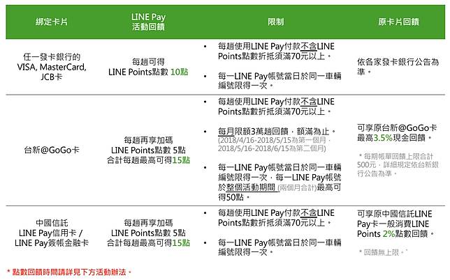 1.活動期間2018/4/16-2018/6/15綁定台新@GoGo卡於1)台灣大車隊車內使用LINE Pay 掃條碼結帳或2)55688 APP選擇使用LINE Pay結帳,且刷卡金額(不含點數折抵)NT70元以上,筆筆可再享LINE Points 5點加碼回饋!每月回饋上限3萬筆(2018/4/16-2018/5/15為第一個月,2018/5/16-2018/6/15為第二個月),活動期間回饋上限共6萬筆,每LINE Pay帳號於整個活動期間(兩個月合計)回饋上限50點。