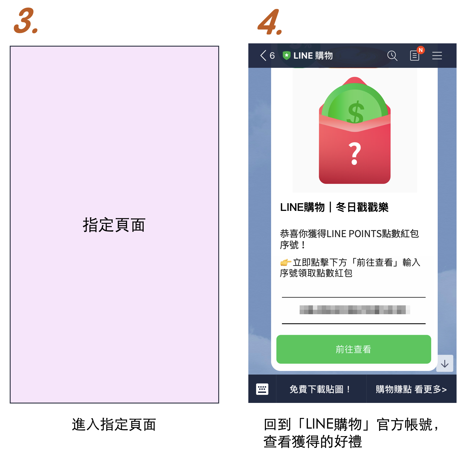 通知獲得好禮後,「LINE購物」官方帳號將發送一組序號給您,請點擊訊息下方的「前往查看」即可至我的點數紅包頁,領取點數紅包。
