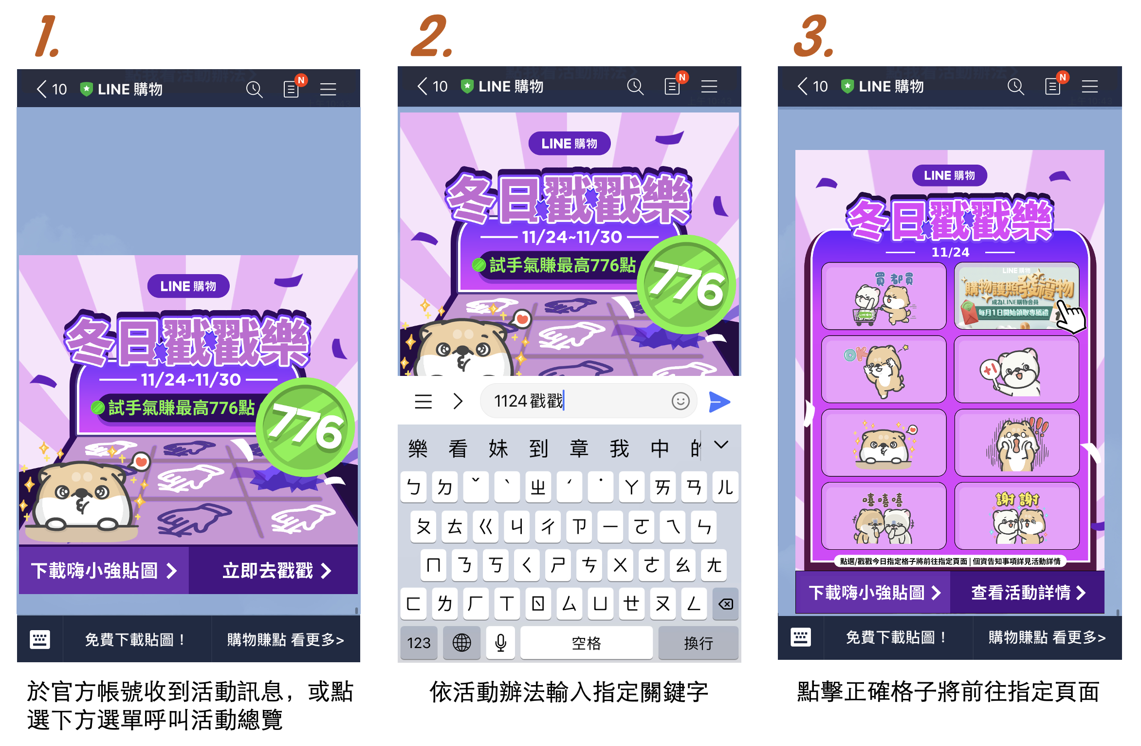 2. 每日於官方帳號輸入每日對應之指定關鍵字(請參考下方關鍵字列表),呼叫每日訊息,找出並點選/戳戳今日指定格子,前往指定頁面