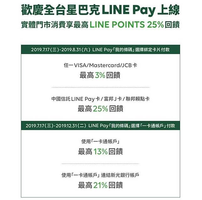 (2) 回饋皆以實際LINE Pay綁定卡片或一卡通帳戶支付之新臺幣金額乘以指定回饋%後四捨五入計算。交易已使用LINE POINTS 點數折抵的金額,恕不計入LINE POINTS 點數回饋活動。