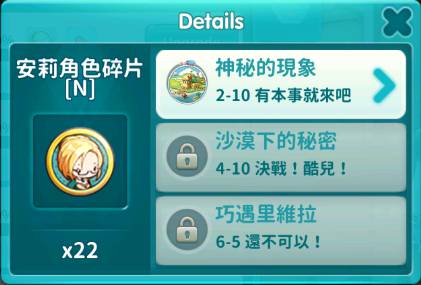 安莉的角色碎片可以在2-10、4-10、6-5關獲得,雖然說2-10的難度不高,但必須要配桿才能開啟第三洞拿三星,花的時間就會比較多,相對的難度就較高。