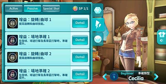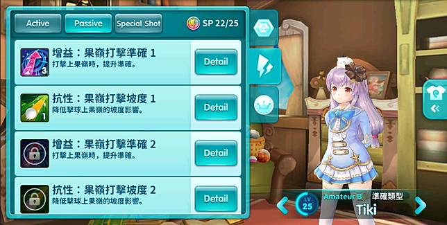 被動技能也都是增加「果嶺打擊」的精準度,並且降低果嶺打擊時受到的坡度影響,可以讓切球的命中率更高。