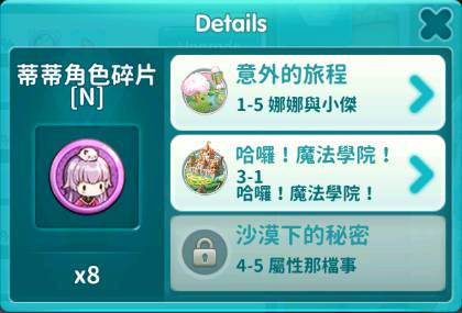 蒂蒂的角色碎片在1-5、3-1、4-5、6-1關可以獲得,加上這是一開始就擁有的角色,強化的難度非常低,1-5要手動拿到3星的難度很低,刷起來的速度很快。