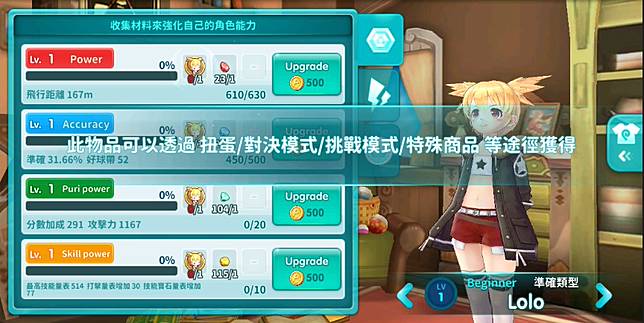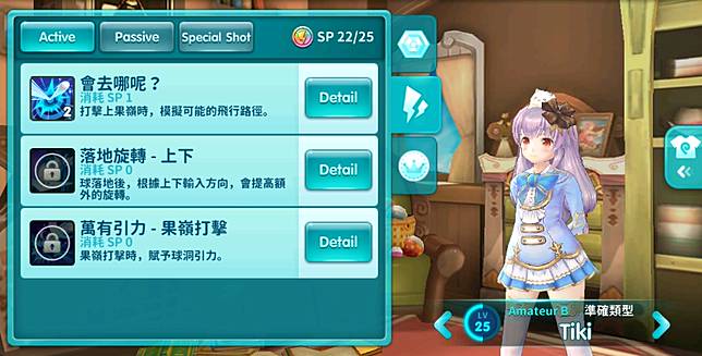 而露露的主動技能則是針對沙坑,解除沙坑球桿的限制跟沙坑坡度,被動技能都是增加沙坑打擊的飛行距離,當球落在沙坑時,露露就會比其他的準確類型角色好用很多。