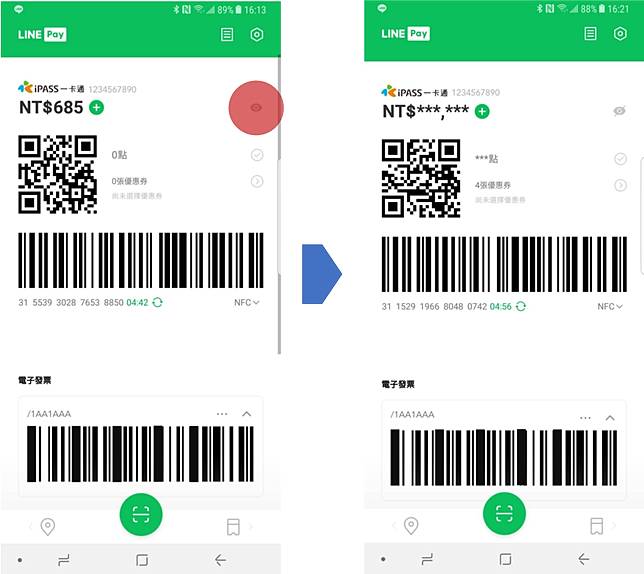 步驟1:點選主頁上「眼睛」圖示,即可將一卡通餘額隱藏或顯示