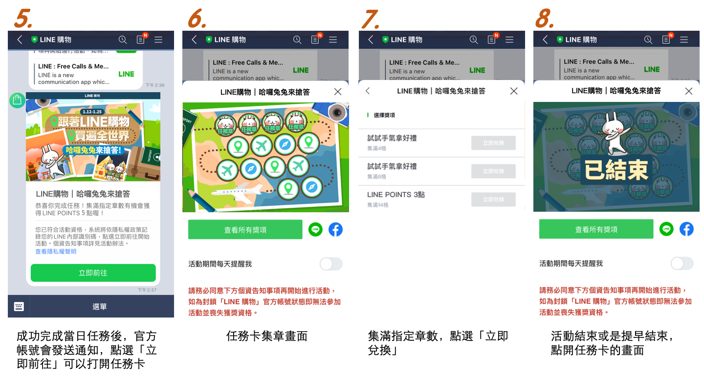 3. 若因用戶網路狀況、裝置差異、手機設定、移轉帳號或其他變更等不可預測之因素導致活動無法順利完成或獲得之獎項遺失,LINE將不負擔任何責任或損害賠償。