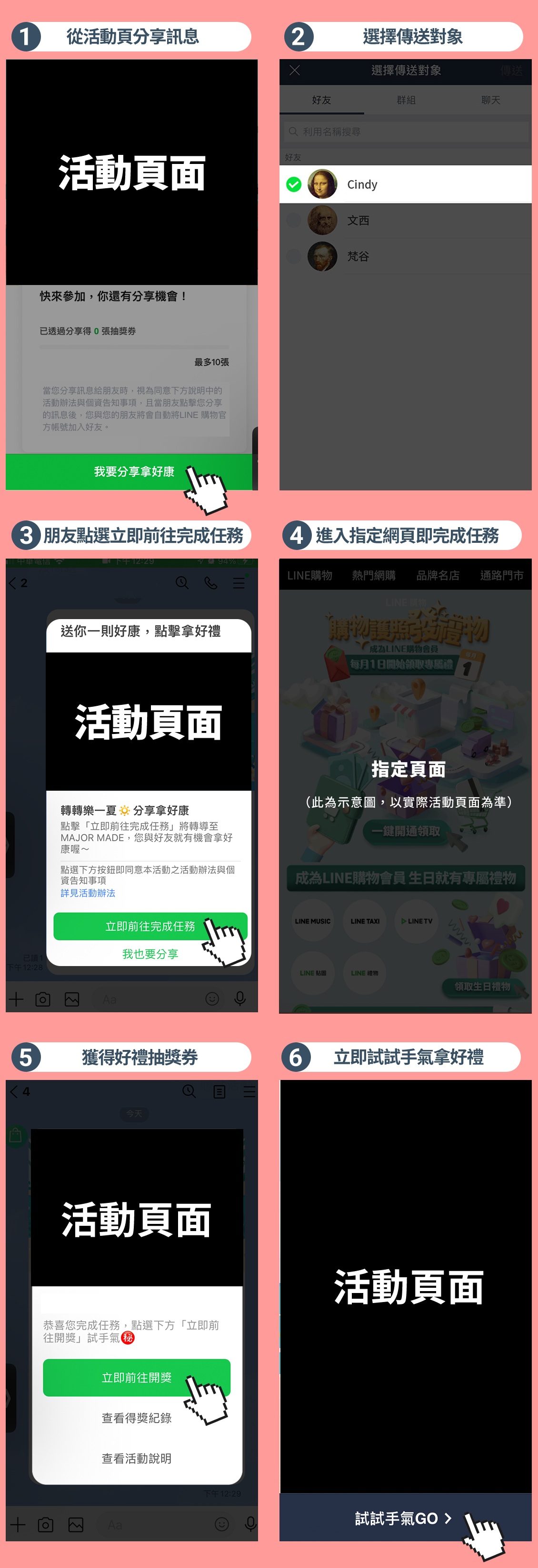 📌流程:從活動頁分享訊息 ➡ 朋友點選網址 ➡ 以LINE帳號成功進入指定活動頁 ➡ 您與好友皆可獲得好康 ➡ 打開好康獲得獎項