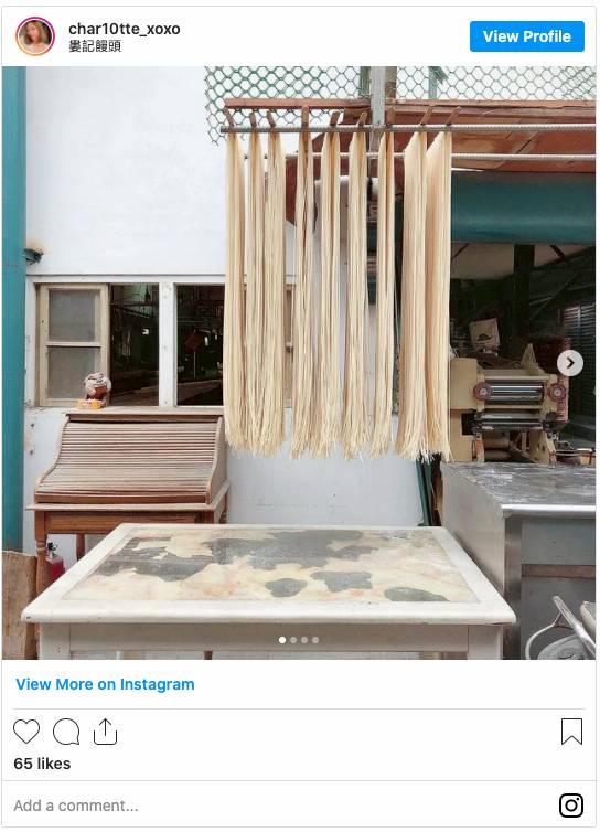 老闆生產的饅頭以天然、扎實為口碑,越嚼越香的麵團陪著老顧客走過一甲子。舖子與手工麵條共用,所以也常常可以看到店門口晾麵條的療癒景觀。